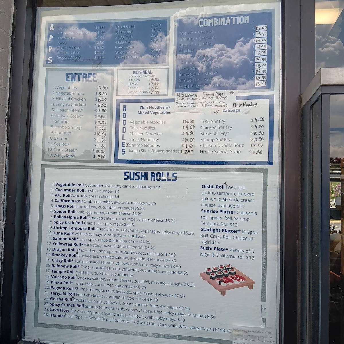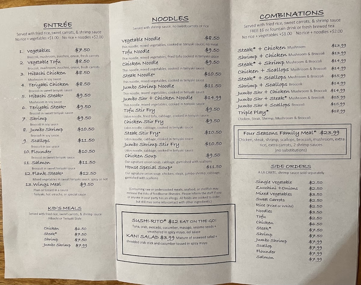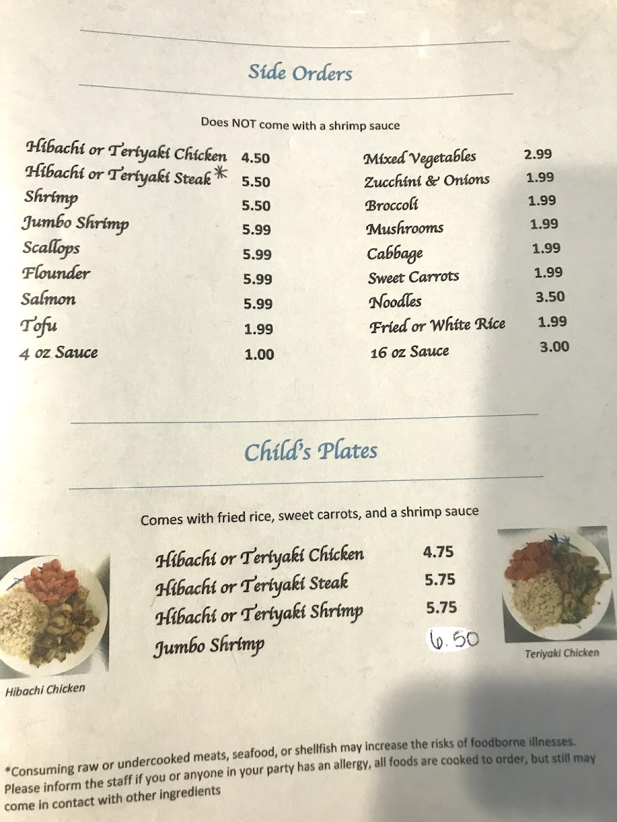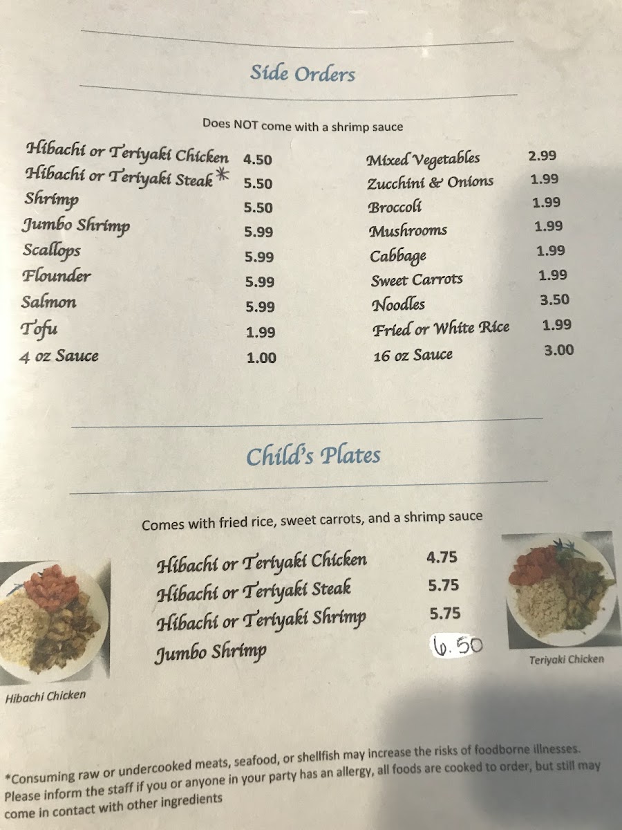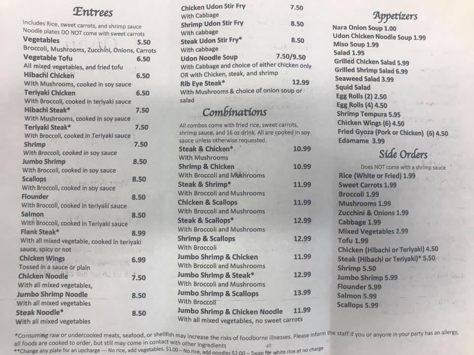 Chicken, Steak, Shrimp, Scallops, broccoli, mushroom, 2 sauces, 2 onion soups OR drinks